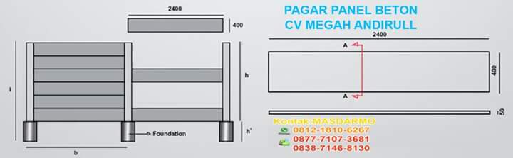 Pagar Beton Precast terdiri dari Panel Beton dan Tiang Beton, Ukuran Panel Beton 5 x 40 x 240 cm, sedangkan ukuran Tiang beton 17 x 18 x 210 – 400 cm.